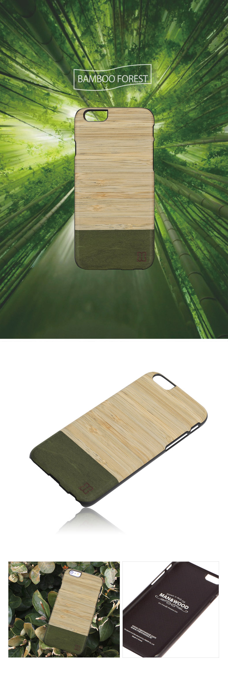 天然竹と天然木(ボリバーグリーン)のハーモニーが一味違うスマホカバーを演出。竹の子と葉っぱをイメージした模様が個性派の逸品です。