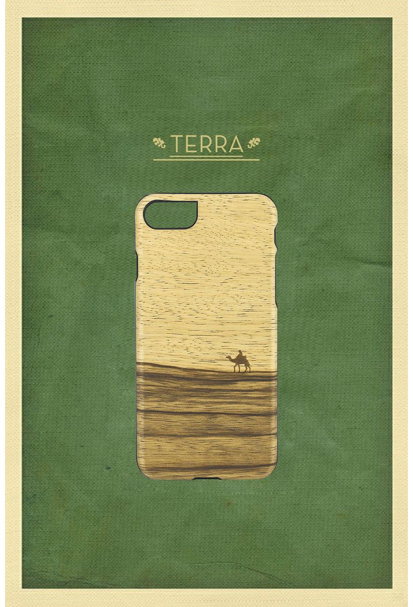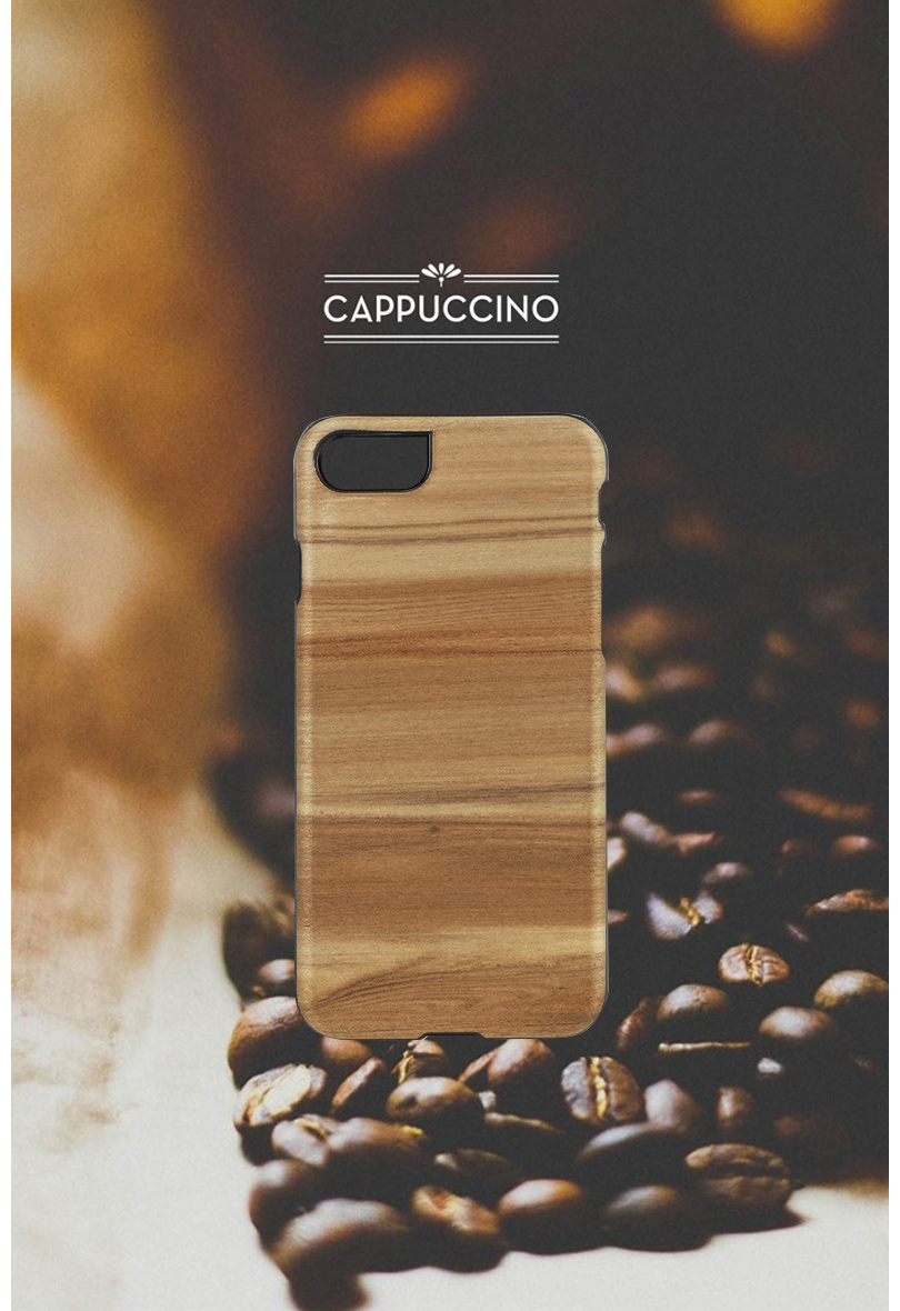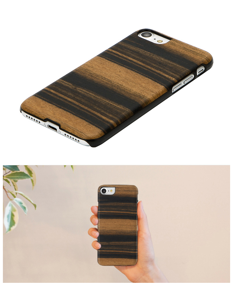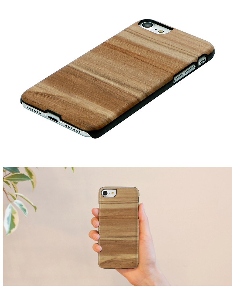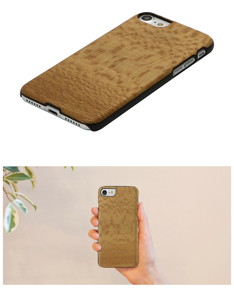 木柄のシールを貼っているのではなく、木をシールでケースに貼っているのでもありません。Man&Wood製品の木の部分は特殊技術により木を薄く切ってポリカーボネートの部分と完全に融合、一体化されています。木が曲がったり剥がれたりすることもありません。また耐水性も優れており水に濡れても品質に問題がありません。