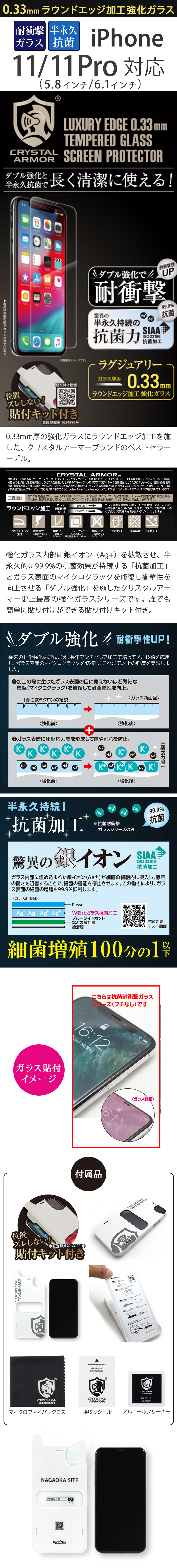 『CRYSTAL ARMOR 抗菌耐衝撃ガラス 0.33mm』 iPhone 11 / 11Pro ガラスフィルム 日本製 耐衝撃 抗菌加工