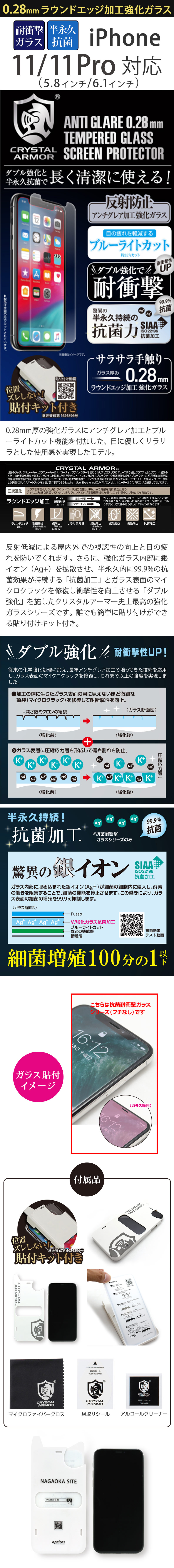 『CRYSTAL ARMOR 抗菌耐衝撃ガラス アンチグレア ブルーライトカット 0.28mm』 iPhone 11 / 11Pro ガラスフィルム 日本製 耐衝撃 抗菌加工