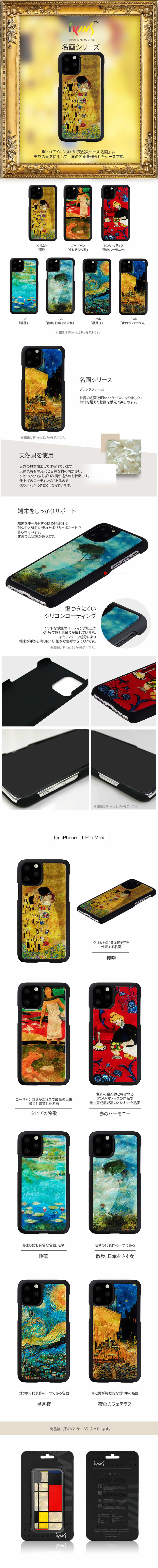 商品名 天然貝ケース 、接吻 タヒチの牧歌 、赤のハーモニー 、睡蓮 散歩 、日傘をさす女 、 星月夜 、夜のカフェテラス for iPhone 11ProMax case ( アイホン11 プロ マックス ケース ・ アイホン イレブン プロ マックス ケース )