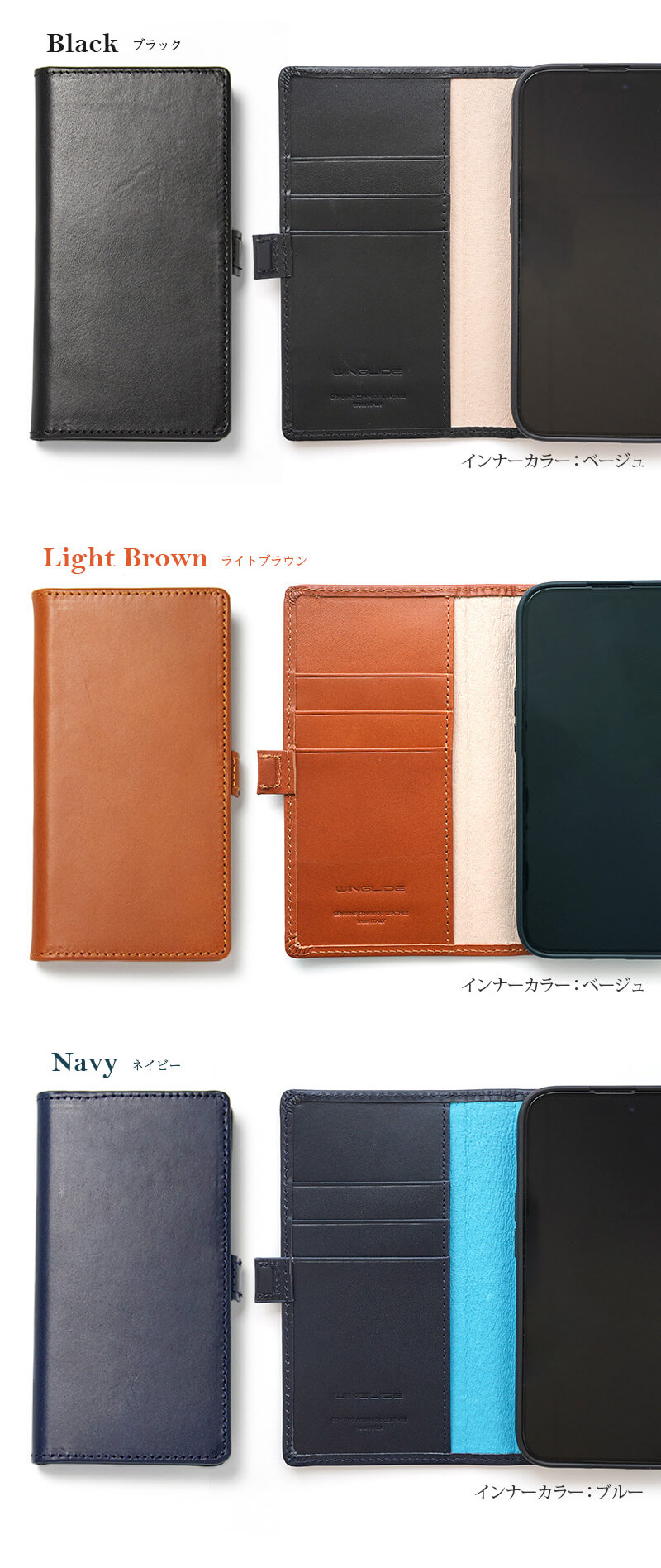 ベーシックで使いやすい3カラー。 男性、女性問わずお使い頂けます。開いた時に見えるインナーカラーが程よいアクセントに。