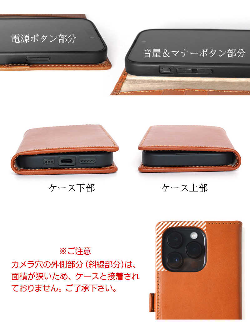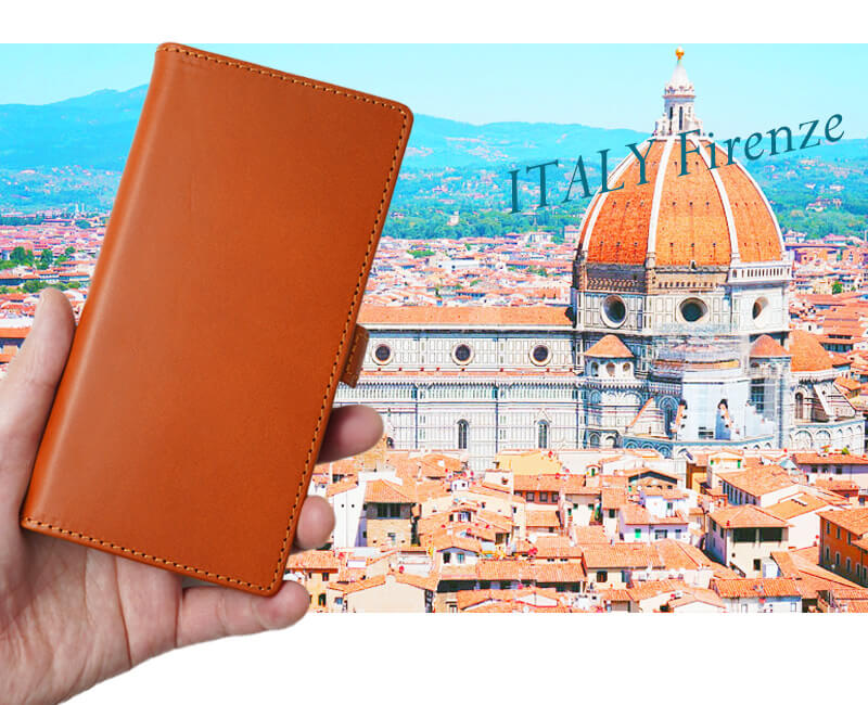 イタリアフィレンツェのタンナー、IL PONTE社でなめされたバケッタレザーを使用したiPhoneケースです。ベジタブルタンニング後ブラッシングにより着色し、ワックスを塗り込み、さらにアイロンを当てて表面をフラットにしています。そのため、表面に適度な艶が生まれ上品な印象に。 手触りも滑らかで、すべすべとしています。また、内貼には丈夫で発色の良いピッグスキン(豚革)を使用し、こだわりのケースに仕上げています。