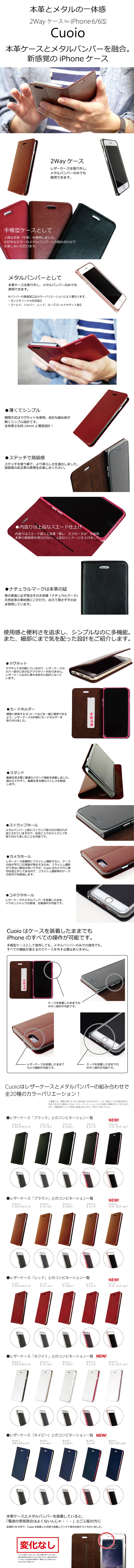 ■本革ケースにメタルバンパーを融合した今までにない新しいデザインのスマートフォンケースCuoio(クオイオ)。本革ケースを外せばメタルバンパーとしても使用できる2wayタイプの製品で、TPOに合わせて服を変えるように着替えることができるケースです。本革ケースとメタルバンパーのカラーバリエーションも豊富にあり、あなたのお好みのスタイルを作り出すことも可能です。