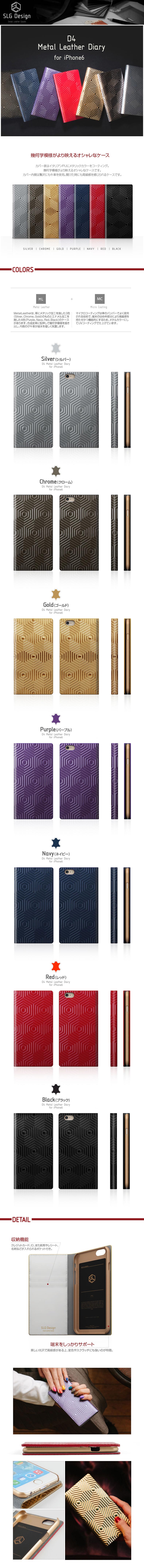 ■Metal Leather SLG deginオリジナルのパターンをメタルレザーに施したMLシリーズは、iPhone6のメタリックなカラーにもふさわしいケースです。 内側のホワイトレザーカーフとのコンビネーションはケースのお洒落感をアップします。