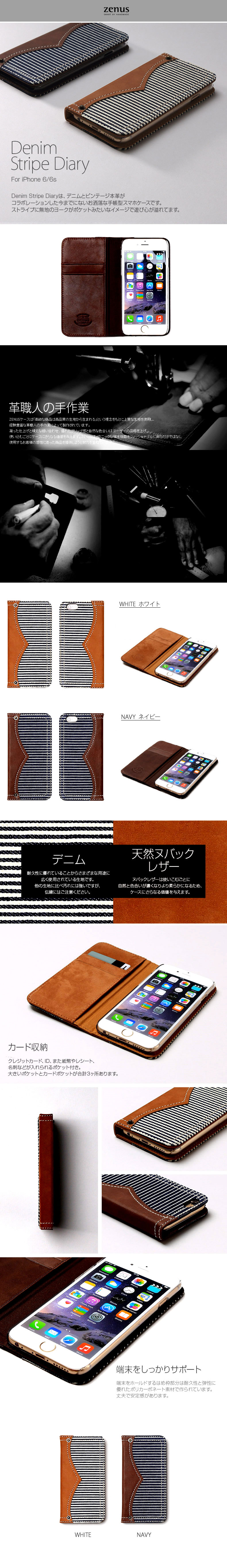 『ZENUS Denim Stripe Diary』 iPhone6s/6 手帳型 ケース デニム 本革