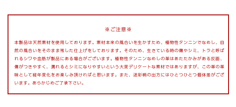 ※本製品は天然素材を使用しております。素材本来の風合いを生かすため、植物性タンニンでなめし、自然の風合いをそのまま残した仕上げをしております。そのため、生きている時の傷やシミ、トラと呼ばれるシワや血筋が製品にある場合がございます。植物性タンニンなめしの革はあたたかみがある反面、傷がつきやすく、濡れるとシミになりやすいという大変デリケートな素材ではありますが、この革の革味として経年変化をお楽しみ頂ければと思います。また、迷彩柄の出方にはひとつひとつ個体差がございます。あらかじめご了承下さい。
