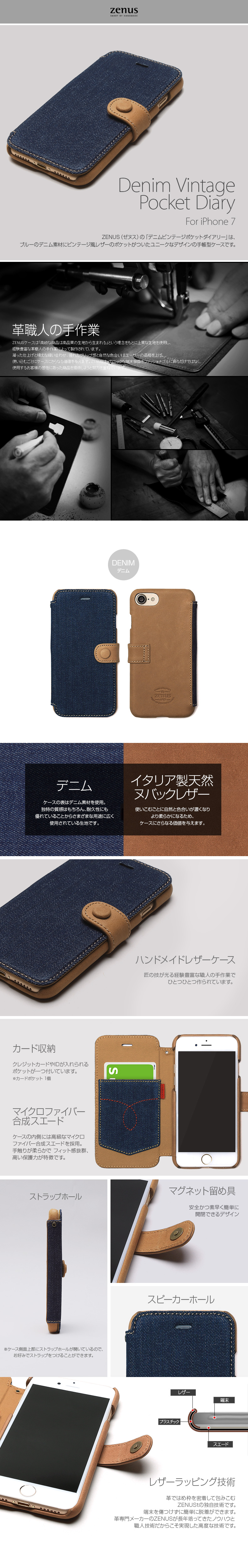 『ZENUS Denim Vintage Pocket Diary』 iPhone SE (第2世代)/ iPhone 8 / iPhone 7 ケース 本革 ヌバック レザー