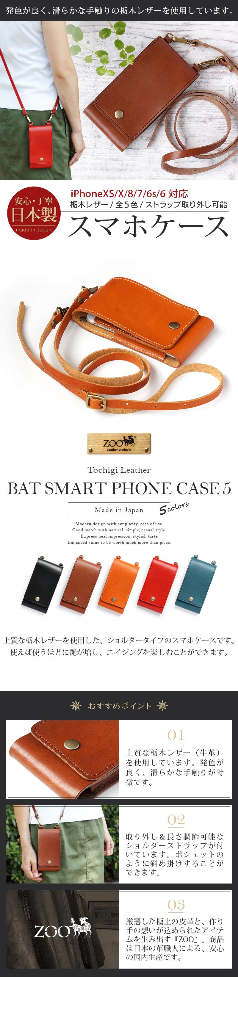【廃番】【栃木レザー】スマホポーチ BAT SMARTPHONE CASE 5 本革 ZOO 日本製