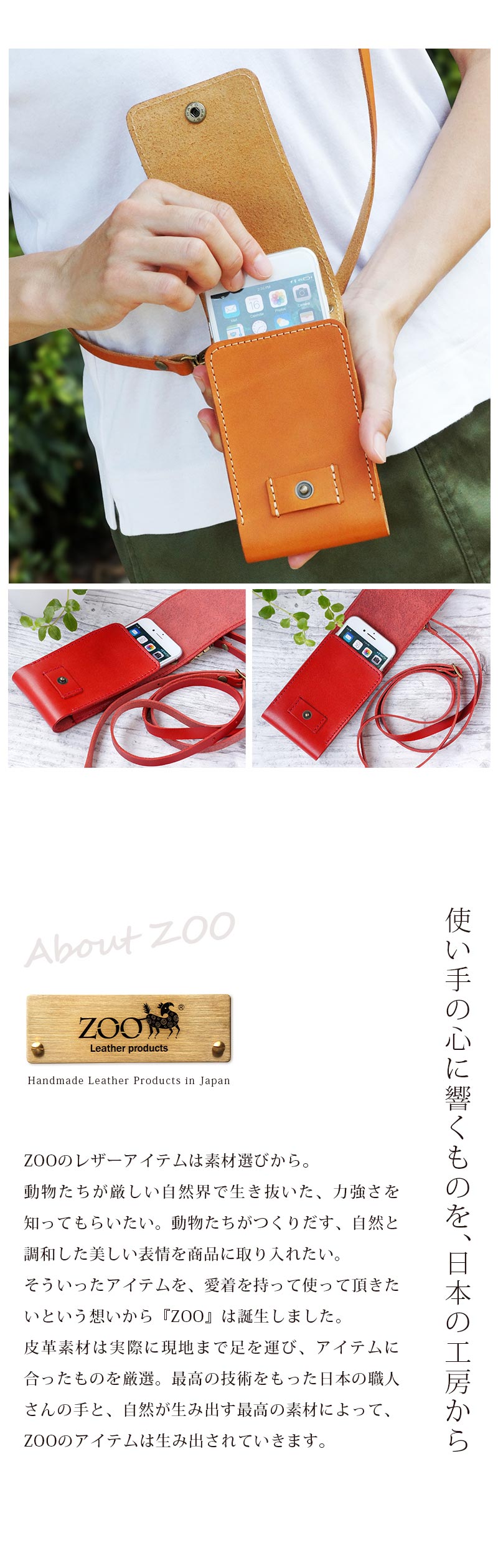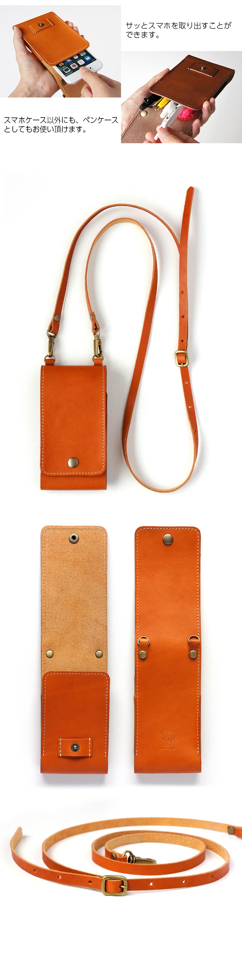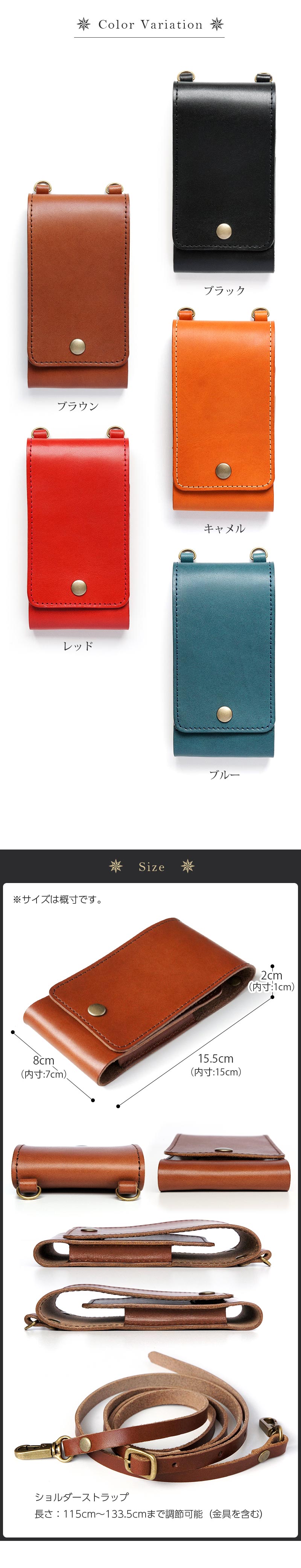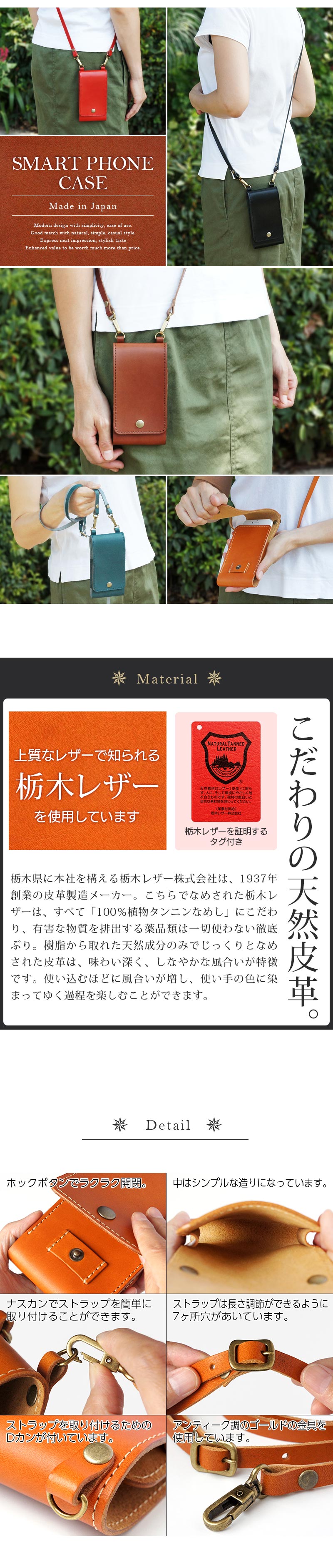 ■上質な栃木レザーを使用した、ショルダータイプのスマホケースです。使えば使うほどに艶が増し、エイジングを楽しむことができます。