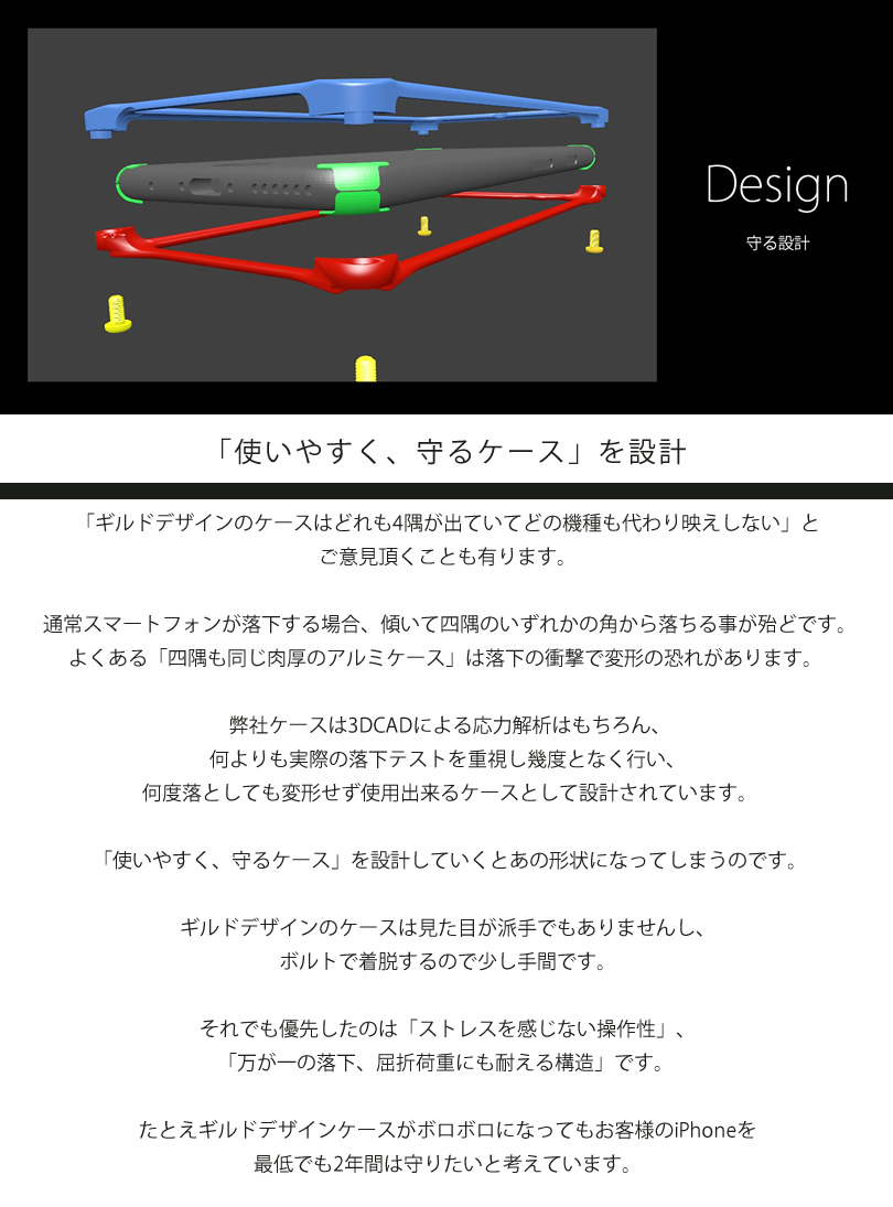 ■ギルドデザインのケースは見た目が派手でもありませんし、ボルトで着脱するので少し手間です。それでも優先したのは「ストレスを感じない操作性」、「万が一の落下、屈折荷重にも耐える構造」です。たとえギルドデザインケースがボロボロになってもお客様のiPhoneを最低でも2年間は守りたいと考えています。