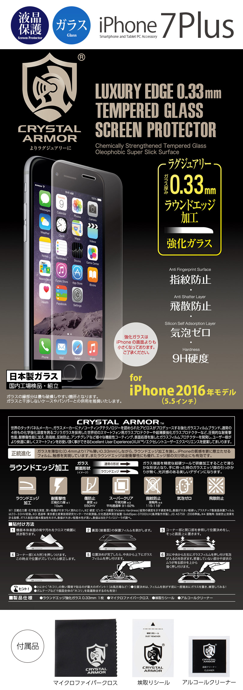 『CRYSTAL ARMOR ラウンドエッジ 強化ガラス 0.33mm』 iPhone7Plus 液晶保護フィルム 表面硬度9H