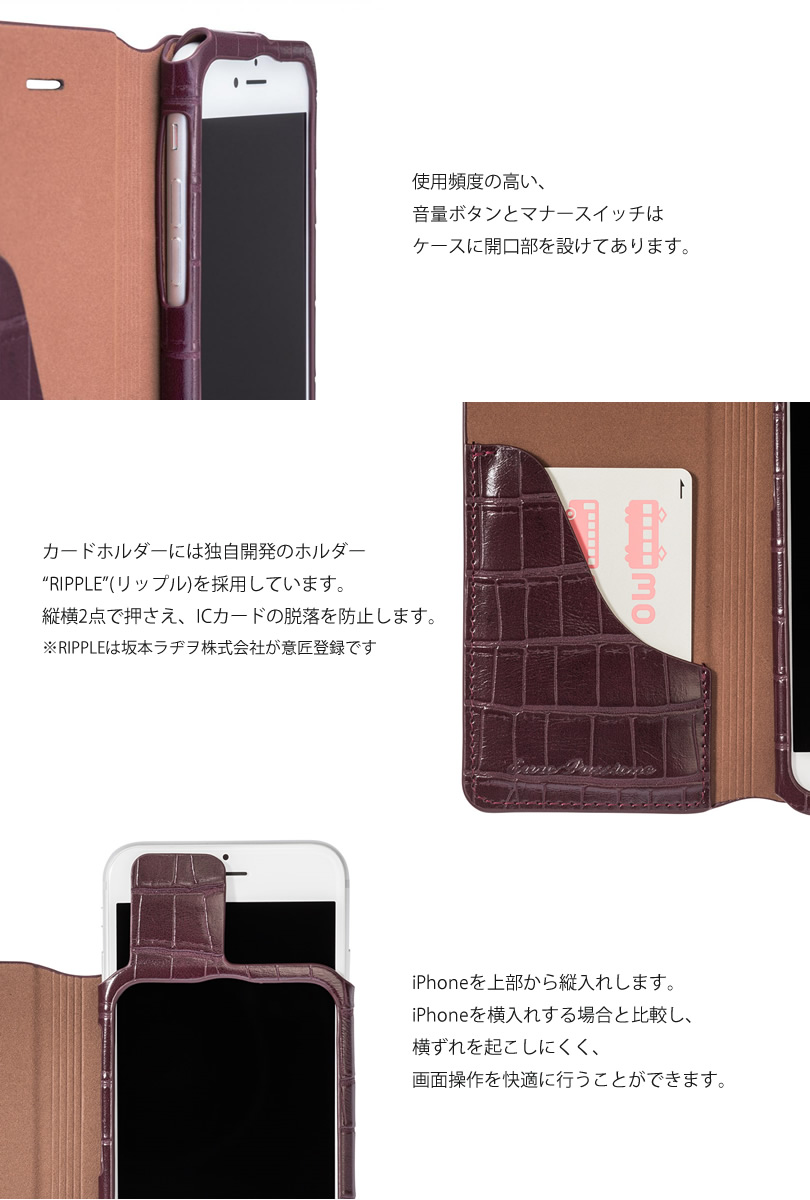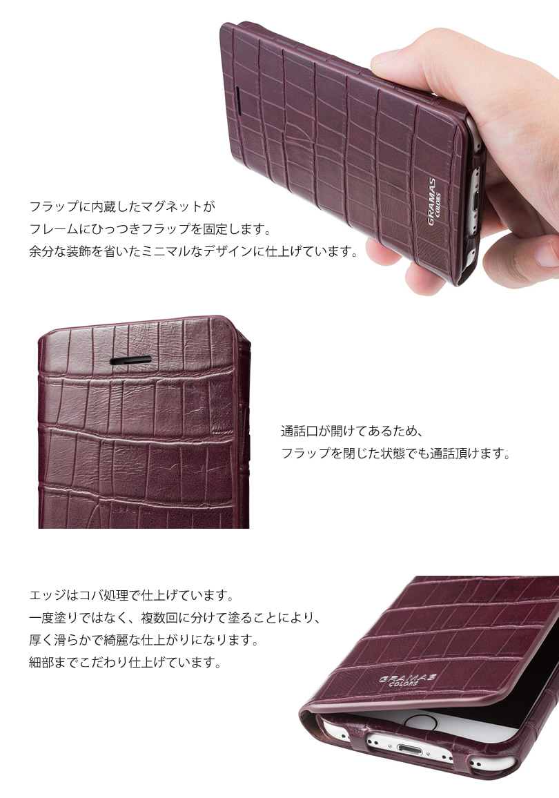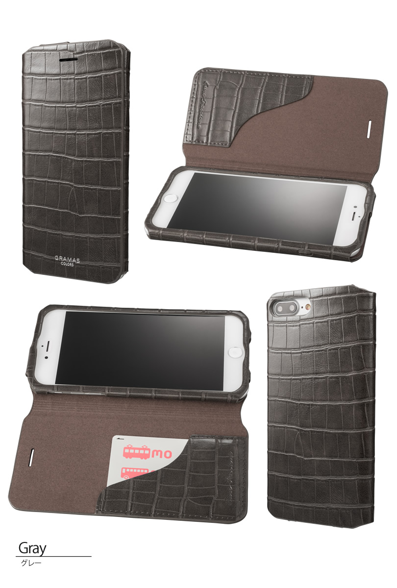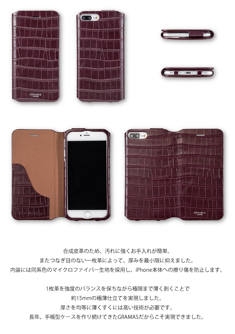 ■クロコダイル型押しのPUレザーを使用した、iPhone 7 Plus 用ケース“EURO Passione3”。GRAMASの代名詞でもあるフルレザーケースの機能性はそのまま、素材に合成皮革を採用することで、よりお求めやすい製品を目指しました。汚れと傷に強い合成皮革の特性を最大限引き出しつつ、ディテールなどを丁寧に作り込み、単なる廉価版ではない製品に仕上げています。