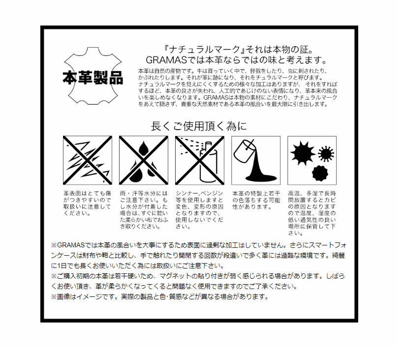 ※GRAMASでは本革の風合いを大事にするため表面に過剰な加工はしていません。さらにスマートフォンケースは財布や鞄と比較し、手で触れたり開閉する回数が段違いで多く革には過酷な環境です。綺麗に1日でも長くお使いいただく為には取扱いにご注意下さい。