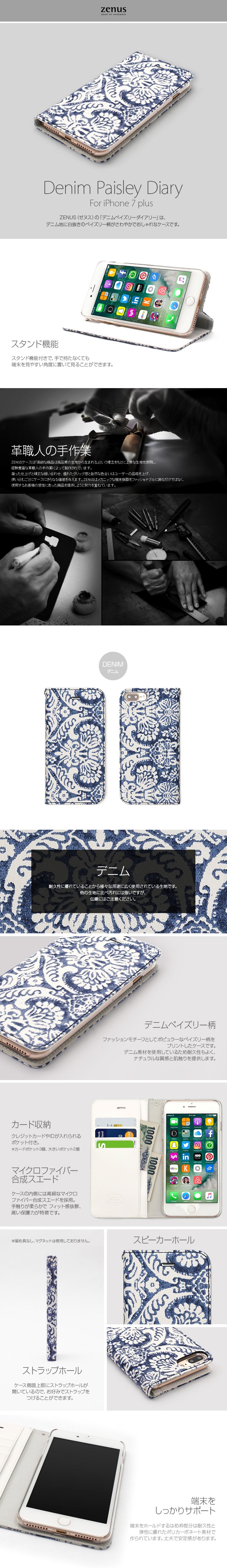 『ZENUS Denim Paisley Diary』 iPhone8 Plus / iPhone7 Plus ケース 手帳 デニム ペイズリー