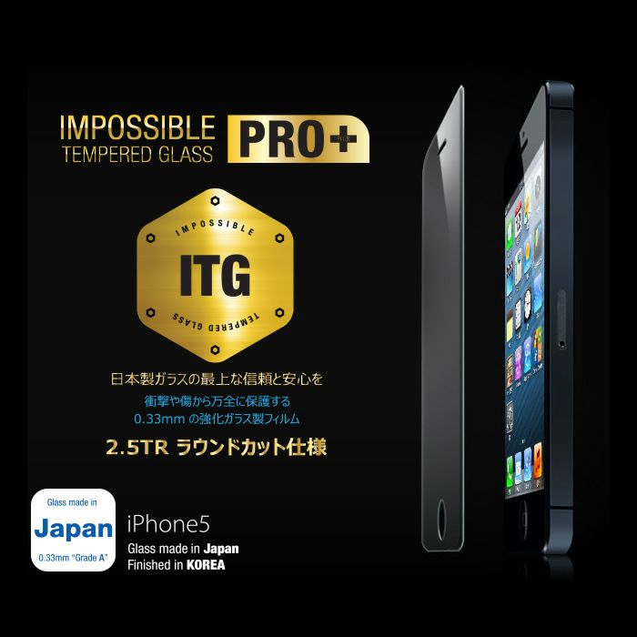 iPhoneSE / iPhone 5s / iPhone 5 / iPhone 5c 用 強化ガラス製フィルム の特長 ■ITG PRO Plusは、最上級強度の0.33mm日本製生ガラスを使用し、表面硬度は9H、 PETフィルムの3倍の強度、ベストな薄さで最大のパフォーマンスを発揮します。 【 強化ガラス製 】 の 【 画面保護フィルム 】 です。 ■ナイフや鍵等の尖ったものでも簡単に傷がつかず、Retinaディスプレイを傷から守り、 最高の透過度を提供する、他製品とは一線を画した無比のガラスフィルムです。 ■当ガラスフィルムはガラスの縁を丸く研磨処理し、縁にかかる衝撃を軽減しています。 ■より強い油分防止コーティングにより、油分やホコリ、指紋に対しての抵抗力が格段に強くなりました。■接着面にシリコンコーティングを施し、簡単に貼り付け出来ます。■ガラス飛散防止。一般的なガラス製品に比べて安全です。■アルミニウムホームボタン付属。 ※アルミニウムホームボタンはiPhoneSE/5sの指紋認証機能には対応していません。 iPhoneSE / iPhone 5s / iPhone 5 / iPhone 5c 用 強化ガラス 製保護フィルム の詳細