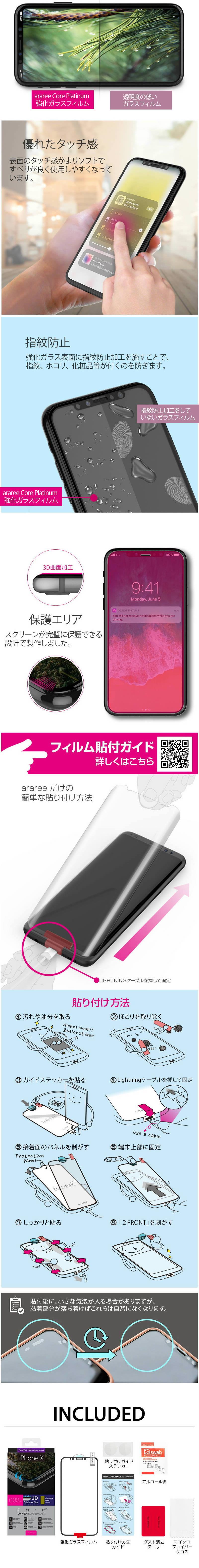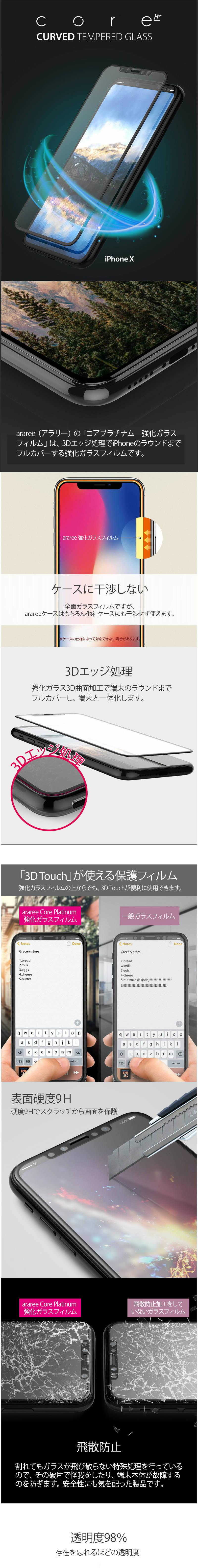 ■araree(アラリー)の「コアプラチナム 強化ガラスフィルム」は、3Dエッジ処理でiPhoneのラウンドまでフルカバーする強化ガラスフィルムです。