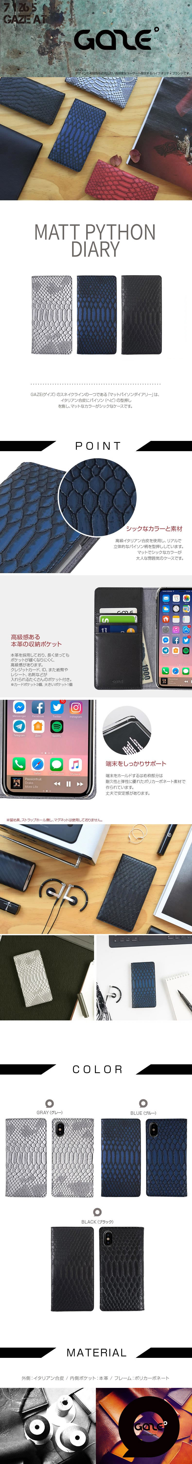 ■GAZE(ゲイズ)のスネイクラインの一つである「マットパイソンダイアリー」は、イタリアン合皮にパイソン(ヘビ)の型押しを施し、マットなカラーがシックなケースです。