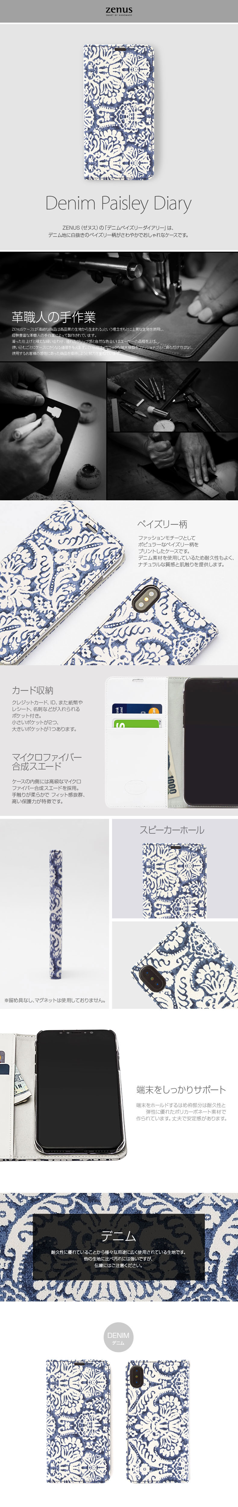 『Zenus Denim Paisley Diary』 iPhone XS ケース / iPhone X / iPhone XR / iPhone XS Max デニム素材 ペイズリー柄